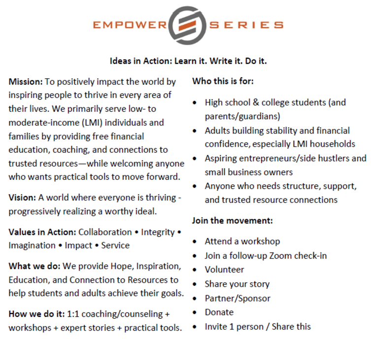 At EMPOWER Series, Inc. we enrich the lives of individuals and the communities in which they live. We can accomplish this with your help. Please join us in our mission and donate now.